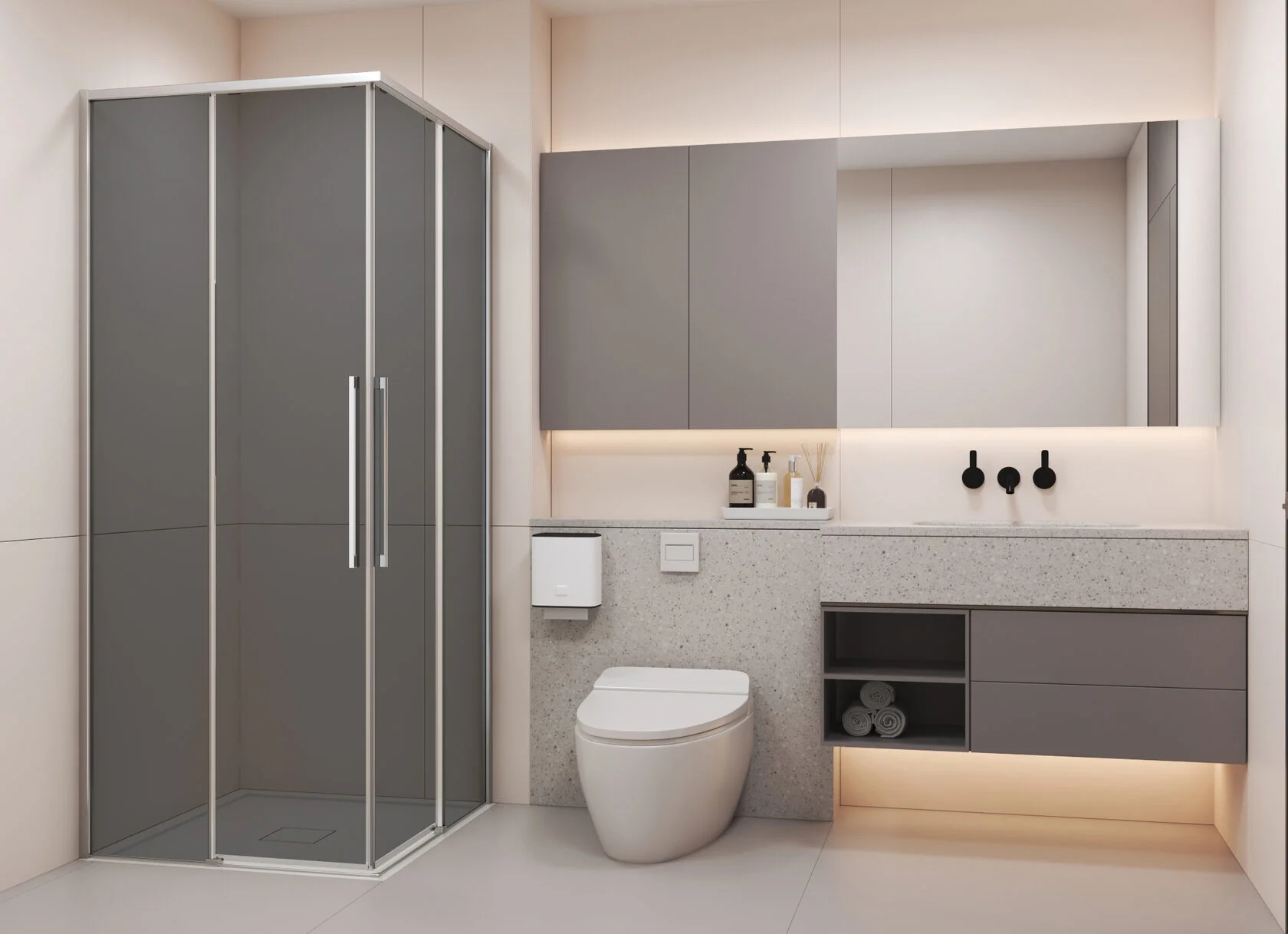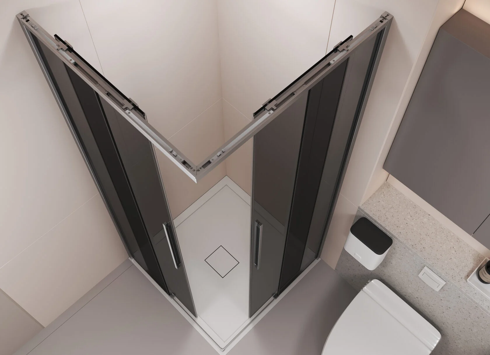 - Раздвижные двери не требуют дополнительного пространства и удобны даже в компактных ванных комнатах